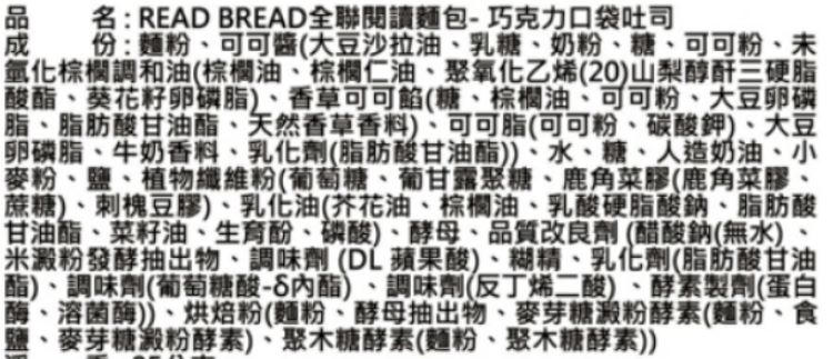 | 內容物(成分) | 麵粉、可可醬(大豆沙拉油、乳糖、奶粉、糖、可可粉、未氫化棕櫚調和油(棕櫚油、棕櫚仁油、聚氧化乙烯(20)山梨醇酐三硬脂酸酯、葵花籽卵磷脂)、香草可可餡(糖、棕櫚油、可可粉、大豆卵磷脂、脂肪酸甘油酯、天然香草香料)、可可脂(可可粉、碳酸鉀)、大豆卵磷脂、牛奶香料、乳化劑(脂肪酸甘油酯))、水、糖、人造奶油、小麥粉、鹽、植物纖維粉(葡萄糖、葡甘露聚糖、鹿角菜膠(鹿角菜膠、蔗糖)、刺槐豆膠)、乳化油(芥花油、棕櫚油、乳酸硬脂酸鈉、脂肪酸甘油酯、菜籽油、生育酚、磷酸)、酵母、品質改良劑 (醋酸鈉(無水) 、米澱粉發酵抽出物、調味劑 (DL 蘋果酸)、糊精、乳化劑(脂肪酸甘油酯)、調味劑(葡萄糖酸-δ內酯) 、調味劑(反丁烯二酸) 、酵素製劑(蛋白酶、溶菌酶))、烘焙粉(麵粉、酵母抽出物、麥芽糖澱粉酵素(麵粉、食鹽、麥芽糖澱粉酵素)、聚木糖酵素(麵粉、聚木糖酵素)) |