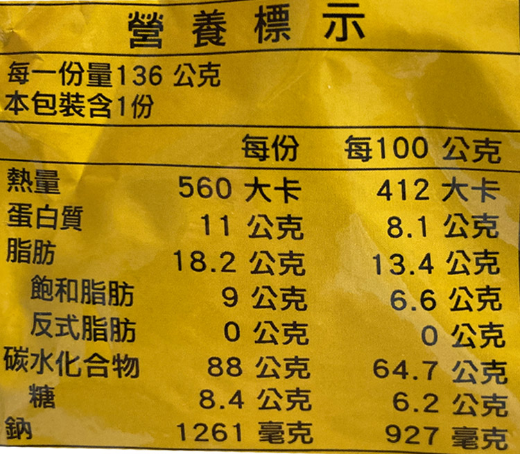 | 食品添加物名稱 | 品質改良劑(碳酸鉀, 碳酸鈉, 磷酸二氫鈉), 抗氧化劑(維生素E),著色劑(核黃素),水解大豆蛋白, 調味劑(L-麩酸鈉, 5'-次黃嘌呤核苷磷酸二鈉),檸檬酸,二氧化矽 |