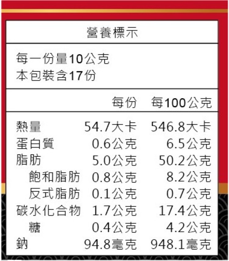 | 過敏源註記 | 本產品含芝麻、大豆及其製品,不適合對其過敏體質食用。本產品生產製程廠房,其設備或生產管線有處理魚、甲殼類、螺貝類、蛋、花生、含有麩質的穀物、堅果類、軟體動物(蠔)、牛奶食物過敏者請留意 |