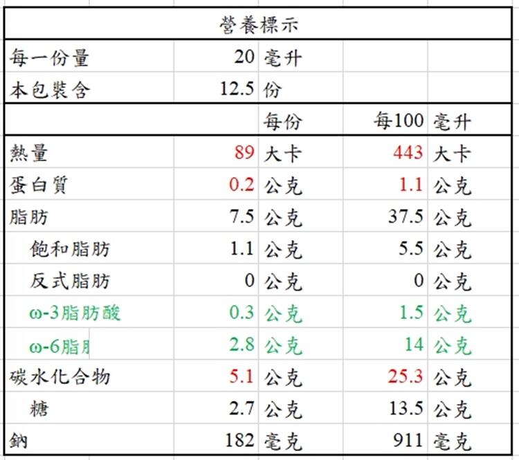 | 內容物(成分) | 大豆油[大豆油.第三丁基氫醌(抗氧化劑)].水.糖.醋.碘鹽.黏稠劑(羥丙基磷酸二澱粉.辛烯基丁二酸鈉澱粉).芥末醬(醋.水.芥末籽.鹽.薑黃.紅椒粉.辣椒.天然香料.大蒜).大蒜.黑胡椒.煙燻香料.百里香.起司香料.調味劑(檸檬酸.乳酸).防腐劑(己二烯酸鉀).玉米糖膠.抗氧化劑(乙烯二胺四醋酸二鈉鈣) |