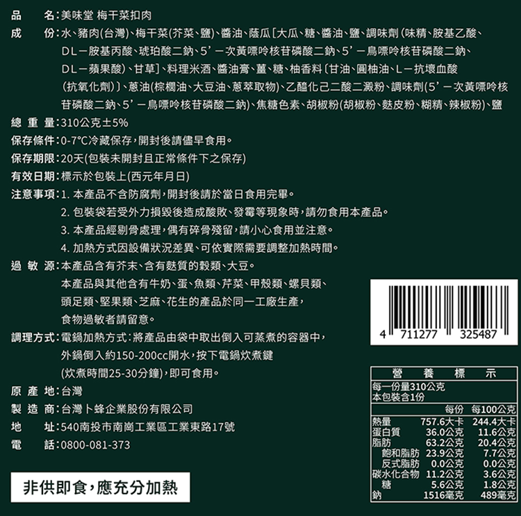 | 其他詳細說明 | 台菜老滋味-苗栗梅干菜+國產三層五花肉 搭配秘方醬汁細火滷製,特選日曬梅乾菜,甘鮮下飯。 |