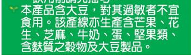 | 過敏源註記 | 本產品含大豆,對其過敏者不宜食用該產線亦生產含芒果、花生、芝麻、牛奶、蛋、堅果類、含麩質之穀物及大豆製品 |