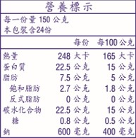 | 過敏源註記 | 本產品內含大豆、含麩質之穀物類、堅果類及其製品成份 |