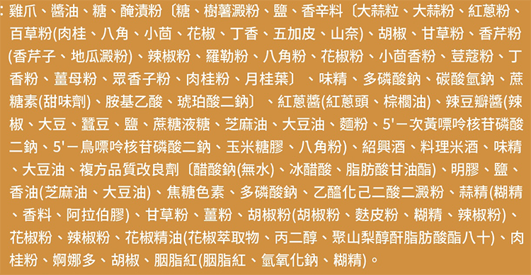 | 內容物(成分) | 雞爪、醬油、糖、醃漬粉{糖、樹薯澱粉、鹽、香辛料〔大蒜粒、大蒜粉、紅蔥粉、百草 粉(肉桂、八角、小茴、花椒、丁香、五加皮、山奈)、胡椒、甘草粉、香芹粉(香芹子、地瓜澱粉)、辣椒粉、羅勒粉、八角粉、花椒粉、小茴香粉、荳蔻粉、丁香粉、薑母粉、眾香子粉、肉桂粉、月桂葉〕、 味精、多磷酸鈉、碳酸氫鈉、蔗糖素(甜味劑)、胺基乙酸、琥珀酸二鈉}、紅蔥醬(紅蔥頭、棕櫚油)、辣豆瓣醬(辣椒、大豆、蠶豆、鹽、蔗糖液糖、芝麻油、大豆油、麵粉、5’-次黃嘌呤核苷磷酸二鈉、5’-鳥嘌呤核苷磷酸二鈉、玉米糖膠、八角粉)、紹興酒、料理米酒、味精、大豆油、複方品質改良劑〔醋酸鈉(無水)、冰醋酸、脂肪酸甘油酯〕、明膠、鹽、香油(芝麻油、大豆油)、焦糖色素、多磷酸鈉、乙醯化己二酸二澱粉、蒜精(糊精、香料、阿拉伯膠)、甘草粉、薑粉、胡椒粉(胡椒粉、麩皮粉、糊精、辣椒粉)、花椒粉、辣椒粉、花椒精油(花椒萃取物、丙二醇、聚山梨醇酐脂肪酸酯八十)、肉桂粉、婀娜多、胡椒、胭脂紅(胭脂紅、氫氧化鈉、糊精)。 |