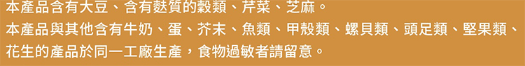| 過敏源註記 | 本產品含有大豆、含有麩質的穀類、芹菜、芝麻。 本產品與其他含有牛奶、蛋、芥末、魚類、甲殼類、螺貝類、頭足類、堅果類、花生的產品於同一工廠生產,食物過敏者請留意。 |