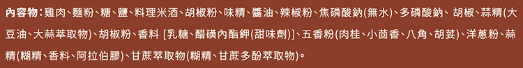 | 內容物(成分) | 雞肉、麵粉、糖、鹽、料理米酒、胡椒粉、味精、醬油、辣椒粉、焦磷酸鈉(無水)、多磷酸鈉、胡椒、蒜精(大豆油、大蒜萃取物)、胡椒粉、香料〔乳糖、醋磺內酯鉀(甜味劑)〕、五香粉(肉桂、小茴香、八角、胡荽)、洋蔥粉、蒜精(糊精、香料、阿拉伯膠)、甘蔗萃取物(糊精、甘蔗多酚萃取物) |