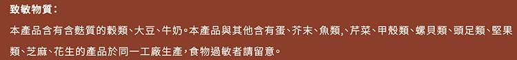 | 過敏源註記 | 本產品含有含麩質的穀類、大豆、牛奶。本產品與其它含有蛋、芥末、魚類、芹菜、甲殼類、螺貝類、頭足類、堅果類、芝麻、花生的產品於同一工廠生產,食物過敏者請留意。 |