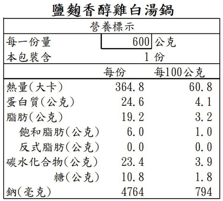 | 產品特色 | -溫潤雞湯基底 -使用日本鹽麴,取代鹽的使用,適合健康取向 -天然發酵鹽麴,可帶出食材自然鮮甜 |