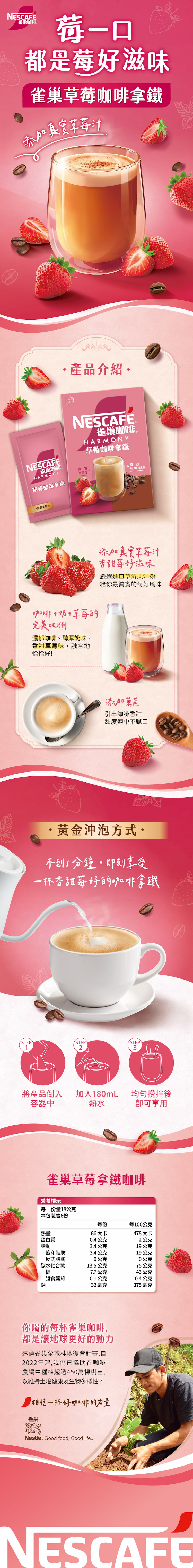 | 產品特色 | ●添加真實草莓汁,提供莓好滋味 ●完美比例結合的香甜草莓與濃醇拿鐵,每一口都是幸福 |