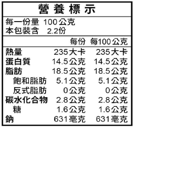 | 內容物(成分) | 豬肉、豬脂、雞肉、糖、磷酸二澱粉、鹽、調味劑(L-麩酸鈉、胺基乙酸、L-天門冬酸鈉、琥珀酸二鈉、5’-鳥嘌呤核苷磷酸二鈉、6’-次黃嘌呤核苷磷酸二鈉)、品質改良劑(多磷酸鈉、焦磷酸鈉(無水)、偏磷酸鉀)、香料(棕櫚油、大豆水解蛋白、中鏈三酸甘油酯、大豆油、香料、天然香料、維生素C) |