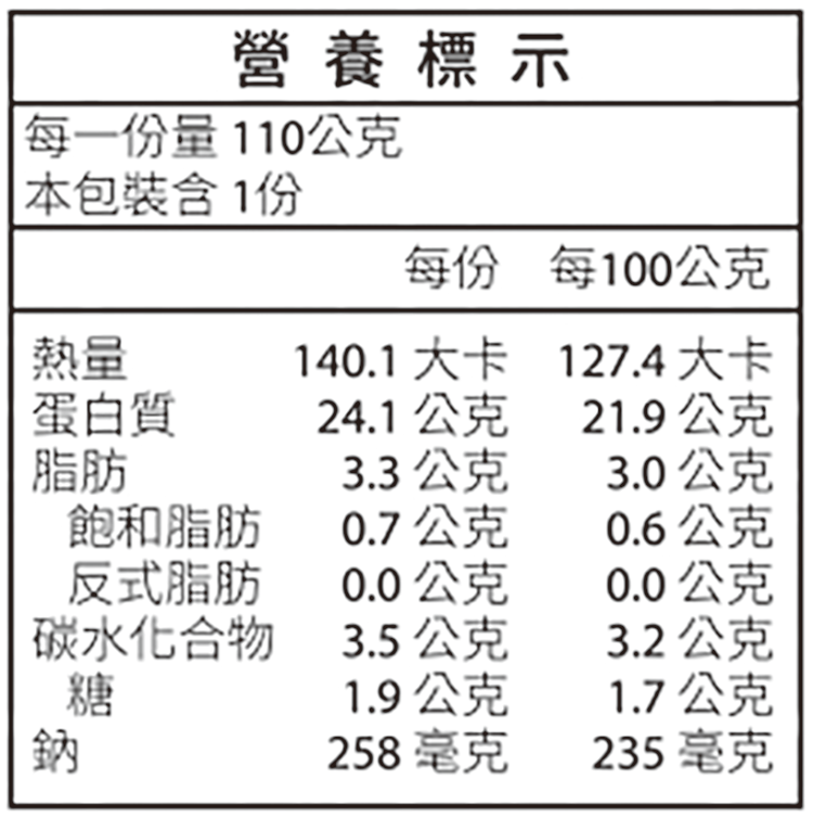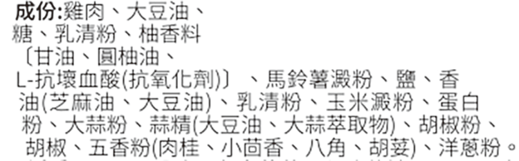 | 內容物(成分) | 雞肉、大豆油、糖、乳清粉、柚香料〔甘油、圓柚油、L-抗壞血酸(抗氧化劑)〕、馬鈴薯澱粉、鹽、香油(芝麻油、大豆油)、乳清粉、玉米澱粉、蛋白粉、大蒜粉、蒜精(大豆油、大蒜萃取物)、胡椒粉、胡椒、五香粉(肉桂、小茴香、八角、胡荽)、洋蔥粉。 |