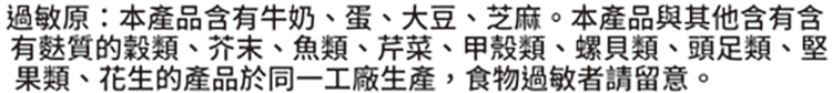| 過敏源註記 | 本產品含有牛奶、蛋、大豆、芝麻。本產品與其他含有含有麩質的穀類、芥末、魚類、芹菜、甲殼類、螺貝類、頭足類、堅果類、花生的產品於同一工廠生產,食物過敏者請留意。 |