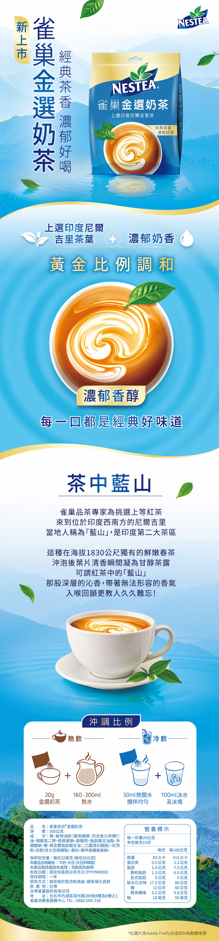 | 產品特色 | ● 雀巢金選奶茶 經典的濃醇好味道 ●上選印度尼爾吉里茶 茶中藍山 香氣回韻 ● 以黃金比例搭配濃郁奶香 |