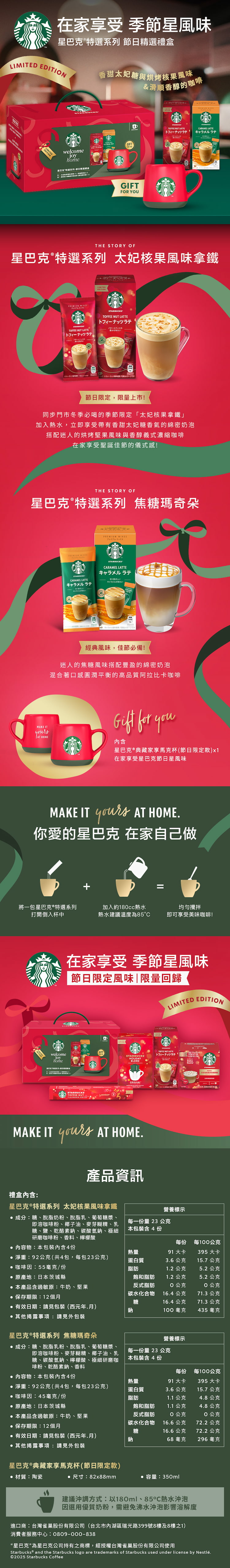 | 產品特色 | ● 嚴選星巴克每天節日熱銷太妃核果拿鐵以及門市經典口味焦糖瑪奇朵,讓消費者在家也有星級享受。 ●靈感源自星巴克門市節日熱銷太妃核果風味拿鐵,香甜太妃風味加上烘烤核果香氣,今年寒冬就讓太妃核果風味拿鐵溫暖你的心吧! ● 內含星巴克典藏家享馬克杯,你愛的星巴克在家自己做! |