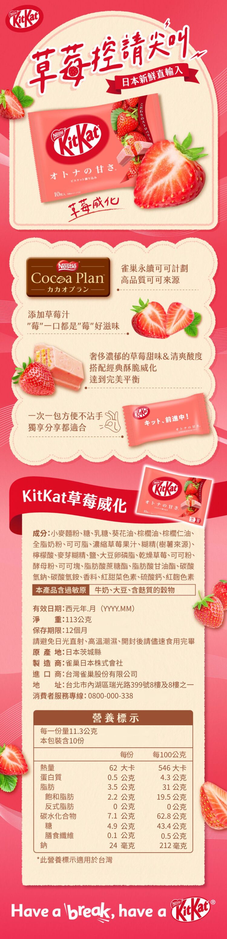 | 商品說明 | 經典酸甜草莓 日本不敗熱銷款 經典KitKat的酥脆威化, 帶來的絕妙口感 日本直輸, 草莓季限量販售 |
