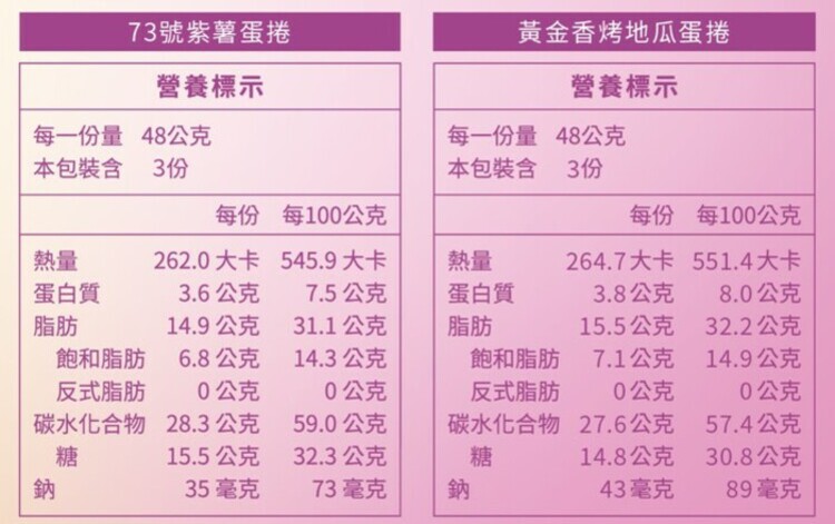 | 內容物(成分) | 73號紫薯蛋捲:雞蛋、植物油(軟質棕油、脂肪酸丙二醇酯、脂肪酸甘油酯)、麵粉、砂糖、紫地瓜粉、紅甜菜粉(紅甜菜濃縮汁、麥芽糊精)、地瓜液體香料、維生素C(抗氧化劑)、鳳梨萃取物(鳳梨萃取物、麥芽糊精) 黃金香烤地瓜蛋捲:雞蛋、植物油(軟質棕油、脂肪酸丙二醇酯、脂肪酸甘油酯)、麵粉、砂糖、地瓜粉、地瓜液體香料、精鹽、鳳梨萃取物(鳳梨萃取物、麥芽糊精) |