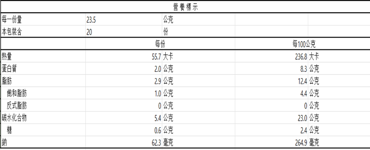 | 過敏源註記 | 本產品含芝麻、麩質穀物。本產品與其他含有甲殼類、芒果、花生、奶類、蛋類、堅果類、大豆、魚類、亞硫酸鹽、芹菜、螺貝類、蕎麥、羽扇豆、芥末、軟體動物類、頭足類、種子類、奇異果的產品於同一工廠生產,請留意。 |