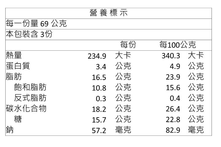 | 過敏源註記 | 本產品含有牛乳、麩質穀物、堅果類、雞蛋和大豆成分 |