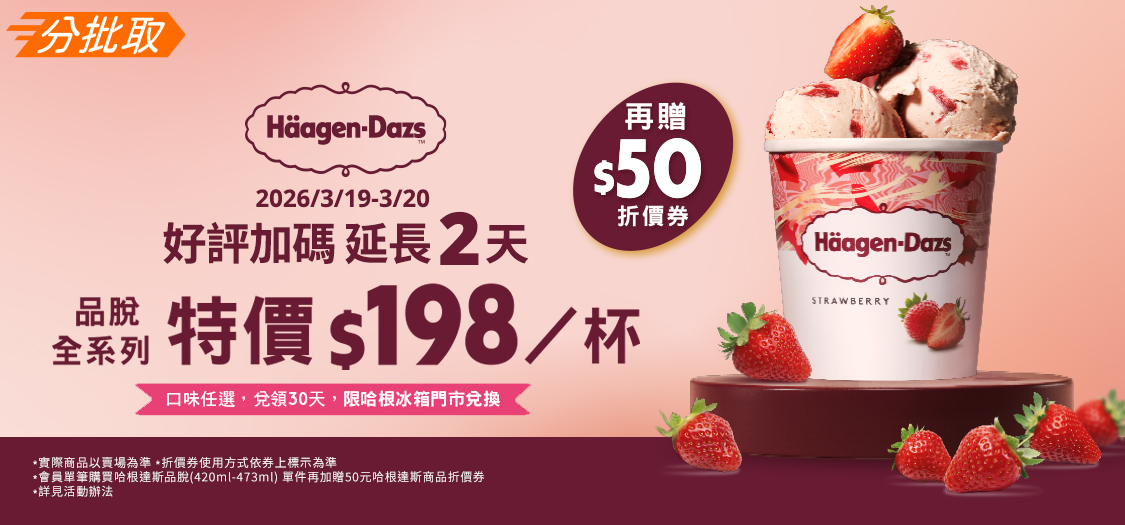 活動期間2026/03/11(三)-03/20(三)於分批取下單購買哈根達斯品脫限時特價$198/杯,再贈$50小時達哈根折價券,本活動並依線上付款完成且訂單成立之時間進行資格判定,每筆訂單贈一張。