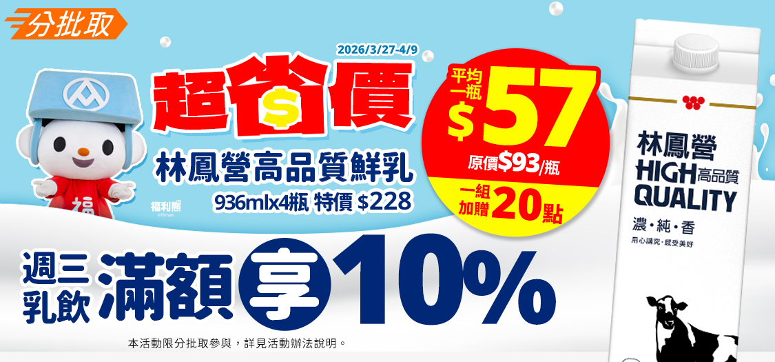 活動期間消費者凡於「全聯分批取」購買「週三乳飲日」專區商品,滿$500即可獲得10%等值之福利點數回饋,以訂單編號為準,本活動點數回饋每會員每活動區間上限500福利點。