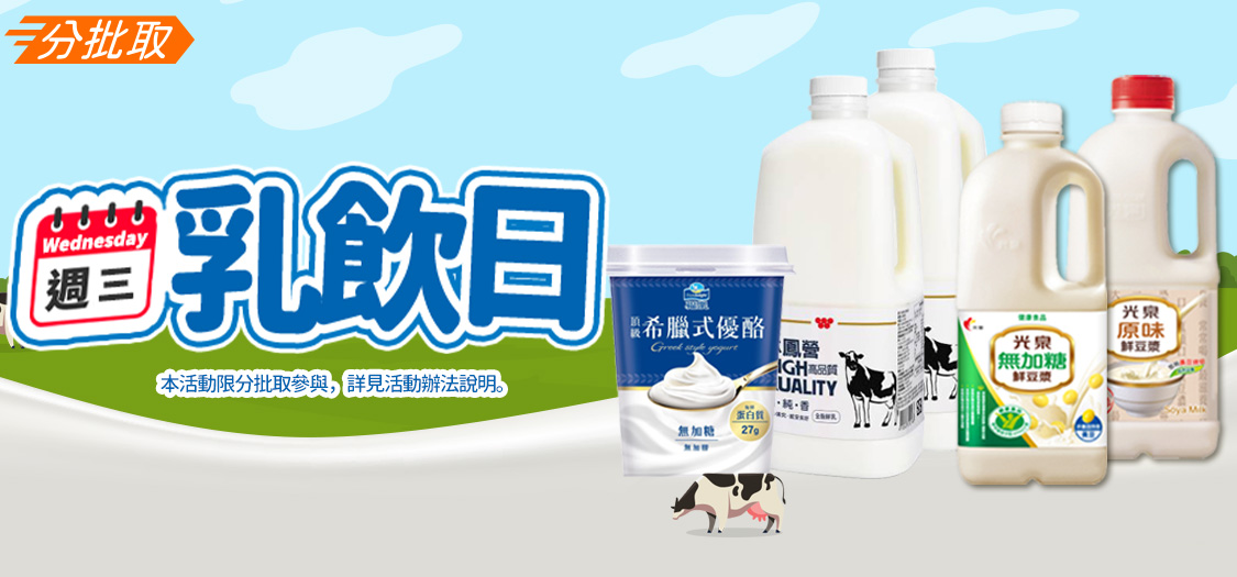 二、 活動案型:分批取「週三乳飲日」專區,單筆滿$500享10%等值福利點回饋。