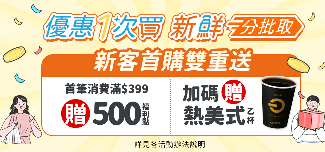 活動期間新客首購單筆滿$399元贈500福利點及OFF