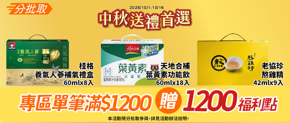 活動期間購買本活動頁中秋送禮專區,單筆$1,200即贈1200點,活動可累計上限合計3600點。