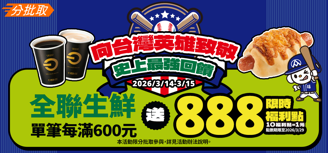 活動期間消費者凡於「全聯分批取」購買「向台灣英雄致敬」專區生鮮系列商品,滿$600即可獲得288限時福利點回饋,以訂單編號為準,本活動點數回饋每會員活動期間上限288限時福利點。※限時福利點使用期限至2026/03/29,逾期失效。